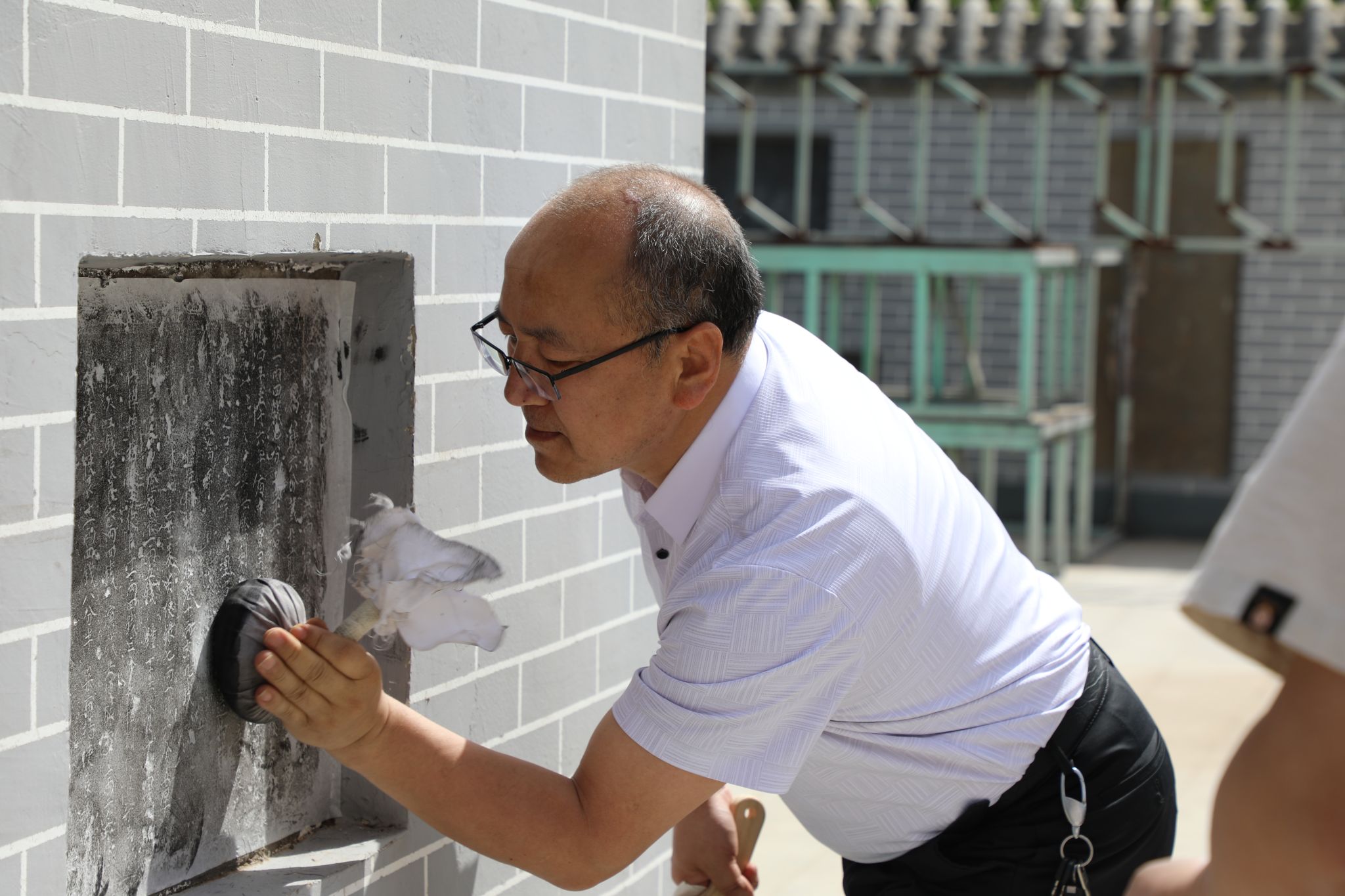 与此同时,活动中,在公蒗蒗老师带领的戏曲博物馆团队有序引导下,师生们利用现场配发的宣纸、拓包、棕刷、墨汁等工具,系统实践了碑面清洁、上纸捶打、上墨拓印到成品揭取的完整工艺流程。通过沉浸式体验各环节技术规范,师生们不仅精准掌握了碑拓技艺的标准化操作要领,更在文化实践层面深化了对传统工艺当代传承价值的认知维度。