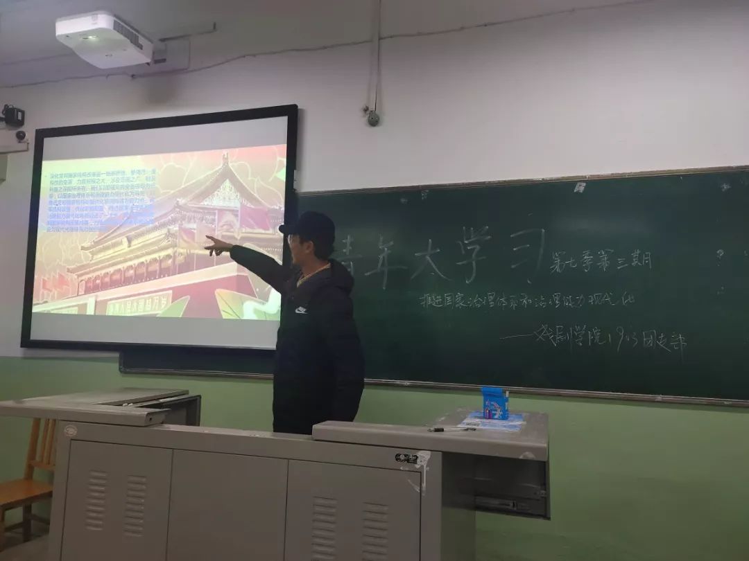 团委组织各团支部坚持开展“青年大学习课前五分钟活动”,学习新思想,争做新青年。11月11日—13日组织各团支部以“学习十九届四中全会精神,不忘青春使命”为主题积极学习“青年大学习”第七季第三期思想内容。本次微团课学习内容丰富,形势稳定,吸取前期微团课经验,顺利开展。