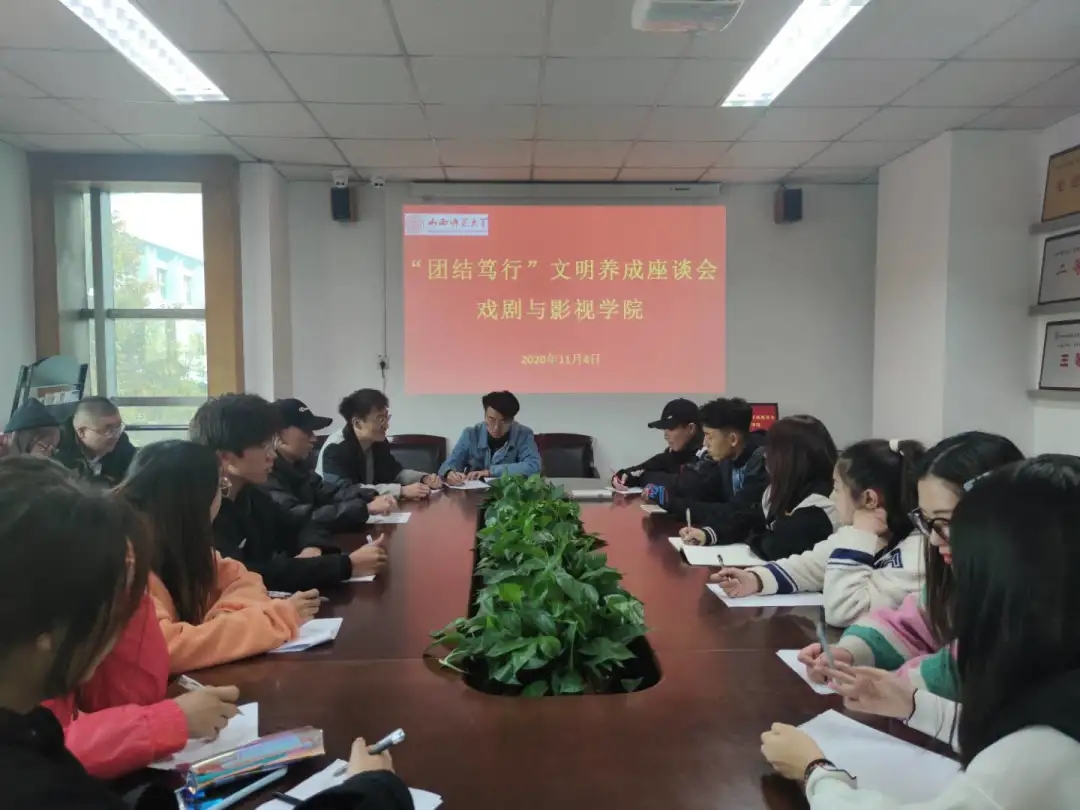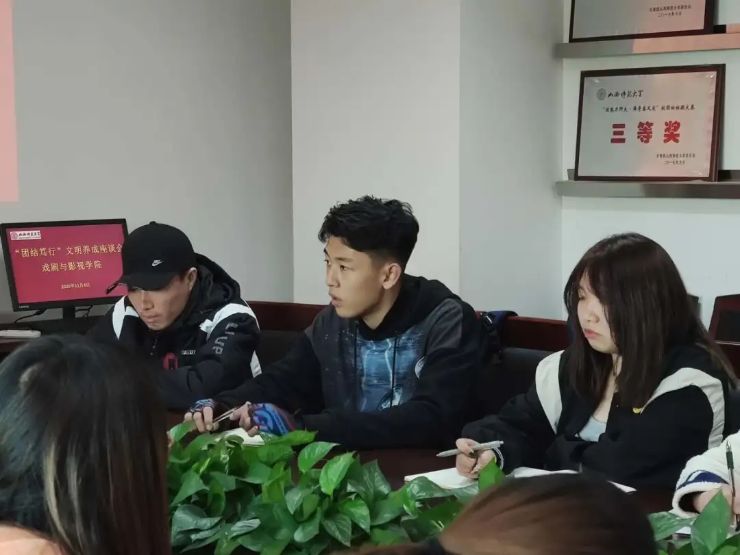 于11月4日中午12:30在科学会堂302会议室开展了以“守初心使命,助文明创建”为行动宗旨、“团结笃行”为主题的座谈会。本次会议由学习调研部部长孙鑫主持,团委学生会干事及19、20级各班干部代表参加。会议伊始,学习调研部部长孙鑫发言,他提出文明养成的重要性,并询问同学们对于文明养成工作的看法,组织关于学校、宿舍、餐厅、自习室里发生的“校园内不文明”现象进行讨论,同学们积极地提出了校园里存在的不文明现象。主要涉及的问题有:自习室占座、校园内抽烟、零食进课堂,宿舍私接电线,食物残渣随意处理等。孙鑫提出必须加强学风建设,团委学生会的服务者和各班班委要做好带头示范作用,将文明之风带进同学们的生活。