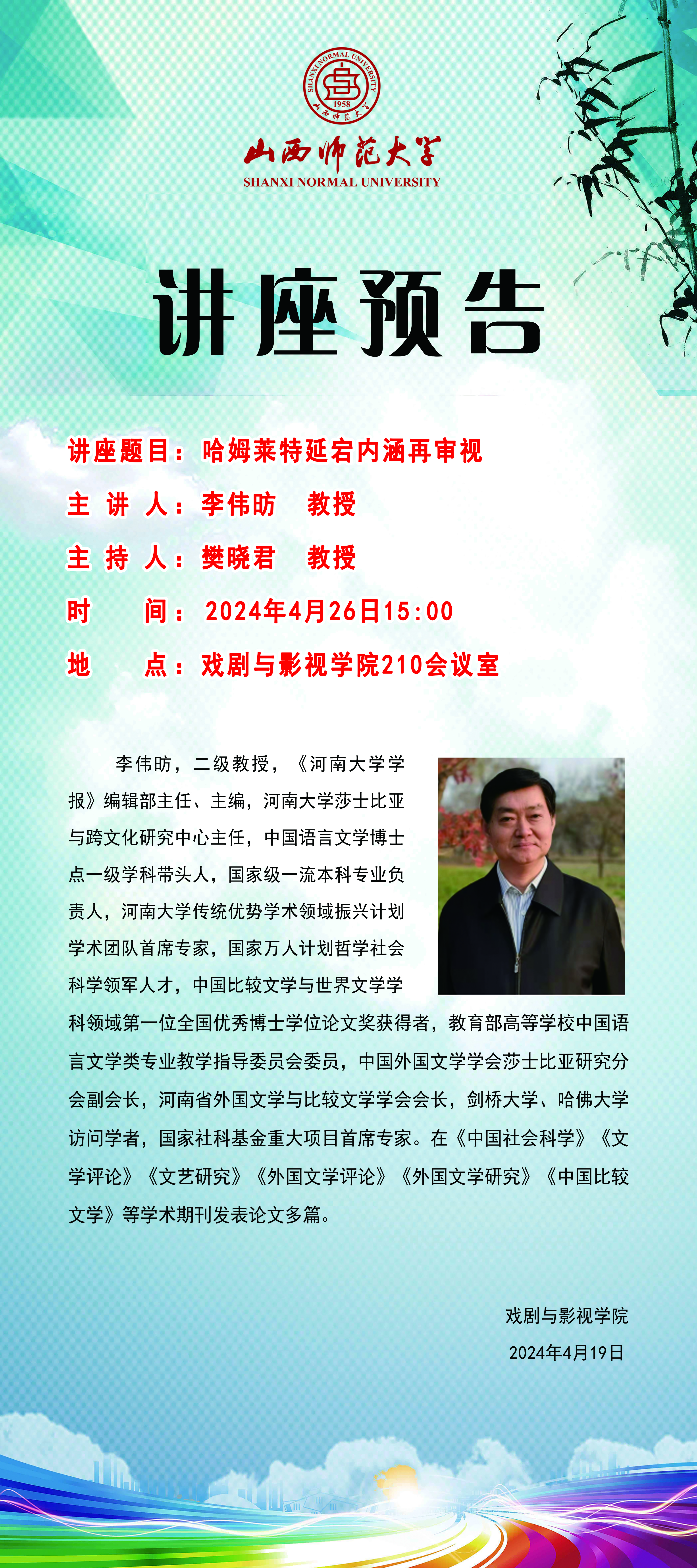 全球赌盘实时动态 拟于2024年4月26日15:00在210会议室举办《哈姆莱特延宕内涵再审视》讲座,主讲人为河南大学李伟昉教授。