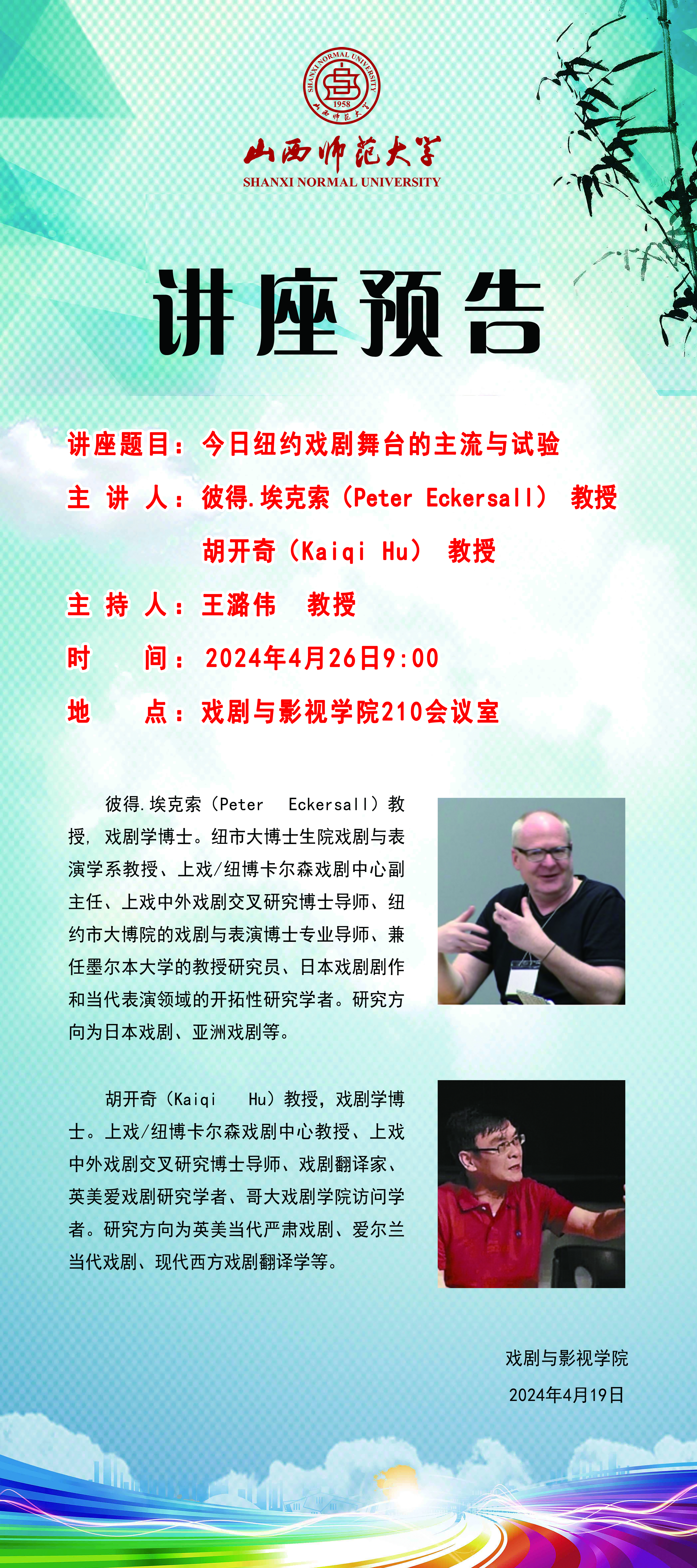 全球赌盘实时动态 拟于2024年4月26日9:00在学院210会议室举办《今日纽约戏剧舞台的主流与试验》讲座,主讲人为彼得·埃克索教授、胡开奇教授。