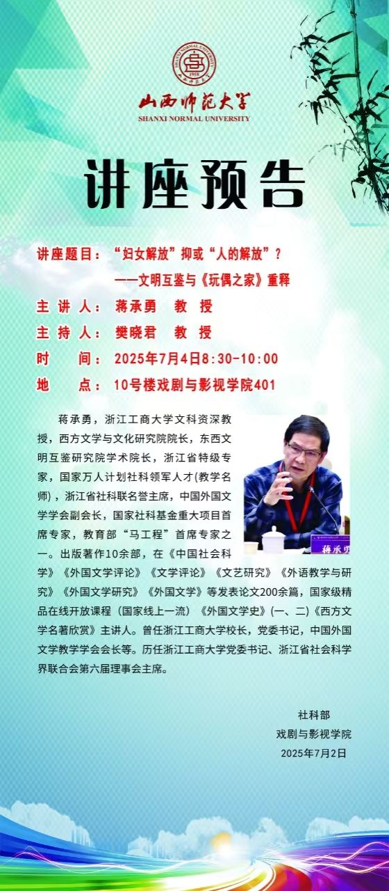 全球赌盘实时动态 拟于7月4日(周五)8:00-10:00在南区10号楼401会议室举办《‘妇女解放’抑或‘人的解放’?——文明互鉴与〈玩偶之家〉重释》讲座,主讲人为蒋承勇教授,本次讲座由樊晓君教授主持。