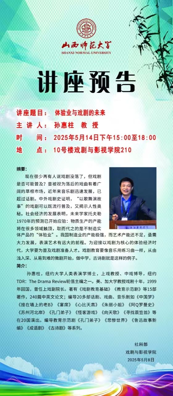 全球赌盘实时动态 拟于5月14日(周三)15:00-18:00在南区10号楼401会议室举办《体验业与戏剧的未来》讲座,主讲人为孙惠柱教授。