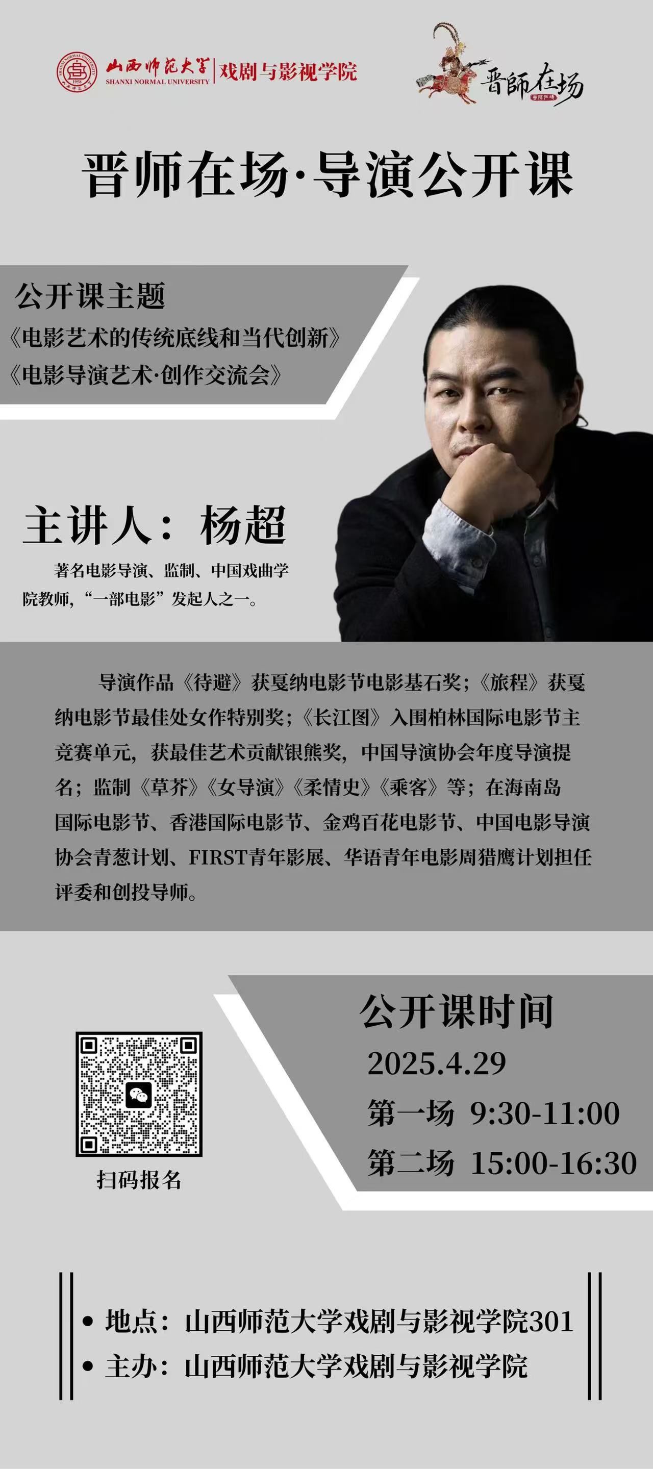 全球赌盘实时动态 拟4月29日(周二)09:30-11:00和15:00-16:30两个时间段在南区10号楼401会议室举办《电影艺术的传统底线和当代创新》和《电影导演艺术·创作交流会》讲座,主讲人为杨超导演。