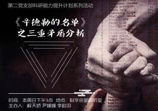第二党支部在科学会堂三楼视听教室举办了主题为“《辛德勒的名单》之三重矛盾分析”的科研能力提升计划活动。活动由支部书记刘于锋指导,研二党员解天娇、尹媛媛,李韵羽筹备,第二党支部党员同志共同参与。