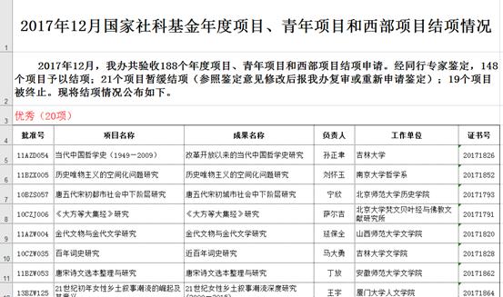 2018年1月4日,从全国哲学社会科学规划办获悉,2017年12月全国哲学社会科学规划办共验收188个年度项目、青年项目和西部项目结项申请。经同行专家鉴定,148个项目予以结项;21个项目暂缓结项;19个项目被终止。此次结项评审共评出20项优秀成果,全球赌盘实时动态