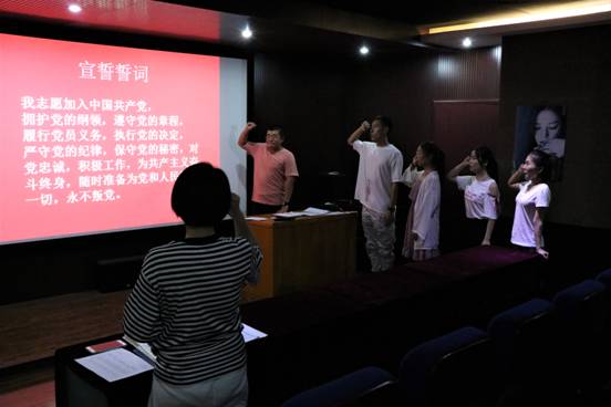 会议第三项,全体党员合唱《国际歌》,之后刘旭东书记带领吕悦桢、刘微微、侯超宇、张丹妮四位同志进行入党宣誓。