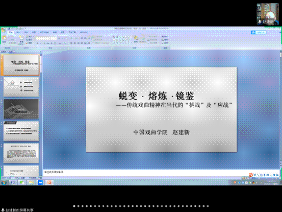 本场报告主要围绕戏曲的“三重传统与历史蜕变”、“精神积淀与时代熔炼”、“技术传承与内外镜鉴”三大板块展开。赵教授首先介绍了学术界关于戏曲传统的研究,并以之为基础,提出自己的观点,对我国传统戏曲精神进行了重新审视。讲座基于中国传统戏曲历史及美学精神的认识与梳理,应用历史学家汤因比的文化“挑战—应战”理论,引述大量例证,展开对当代戏曲创作与舞台现状的探讨,对戏曲艺术的功能指向、美学形态、文学精神等进行了详细解读。