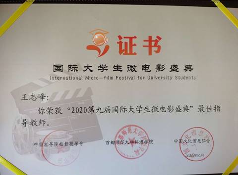 副院长、博士生导师王志峰教授赴宁夏银川出席2020第九届国际大学生微电影盛典,本次盛典在今年4月到9月的作品征集中,共收到国内210所高校、国外30多所高校的5000余部作品报名参赛。王志峰教授荣获“最佳指导教师奖”,指导作品《老兵王艾甫和他的博物馆》获纪实类三等奖。