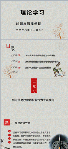 会议首先由孔美艳老师带领大家学习了《新时期高校教职工职业行为十项准则》《高校教师师德失范行为处理的指导意见 》及《党的十九届五中全会公报》等文件的相关内容。前者要求高校教师要坚守十项基本准则,包括坚定政治方向、自觉爱国守法、传播优秀文化、潜心教书育人、关心爱护学生、坚持言行雅正、遵守学术规范、秉持公平诚信、秉持公平诚信、坚守廉洁自律、积极奉献社会;后者分别从教师本人、院系领导、校领导、制度制订、落实,渎职追责等角度明确了高校教师师德失范相关人员的责任和处罚;关于第三个文件,孔老师从“一个重要判断”“决胜建成小康社会所取得的10方面决定性成就”“我国发展环境面临的深刻负责变化(包括国际国内的机遇和挑战)”“到2035年要实现的9方面远景目标”“‘十四五’时期经济社会发展的6方面主要目标”“实现奋斗目标的12方面具体措施”几方面介绍了党的十九届五中全会的主要精神。