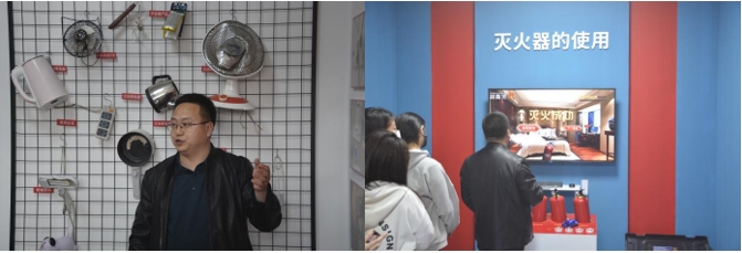 保卫部李志登老师带领学生参观。详细介绍了高校主要火灾起因和安全隐患。他强调,要使用正规插座,离开寝室时要切断寝室内的电源,关闭插线板,一定要将火灾的风险扼杀于摇篮之中。随后向同学们介绍了火灾发生的场景和常用的消防器材,进行模拟灭火,学习心肺复苏的相关知识。