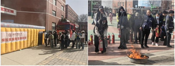 随后在室外进行实操培训,在演练中,陈泽班长向大家讲解并演示灭火器、过滤式消防自救呼吸器等消防器材的使用方法和注意事项,并向大家强调消防安全的“四懂”“四会”。最后,在校保卫部消防科老师们的指导下进行了灭火器实操培训,并共同体验了模拟烟雾逃生。