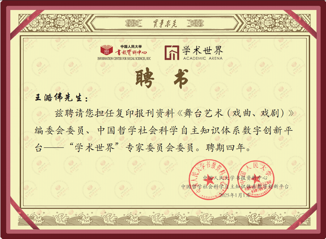 院长,教授,博士生导师王潞伟被聘为人大复印资料《舞台艺术(戏曲、戏剧)》编委会委员、中国哲学社会科学自主知识体系数字创新平台——“学术世界”专家委员会委员。