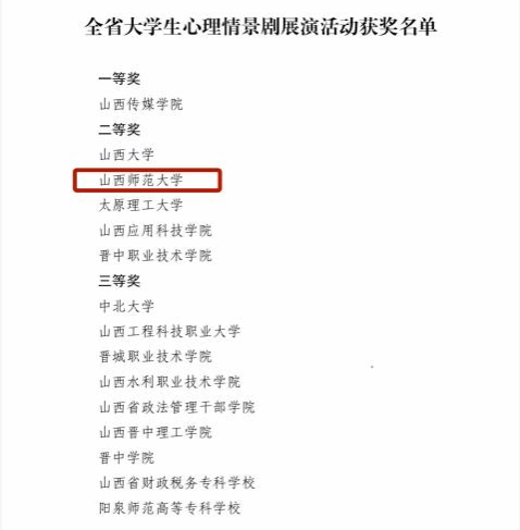 5月27日,山西省首届大学生校园心理情景剧大赛决赛在中北大学科艺苑隆重举办。全球赌盘实时动态 参赛作品《镜中她说》,由全球赌盘实时动态 翟琦老师指导,经过激烈角逐,最终凭借卓越的表现荣获二等奖。