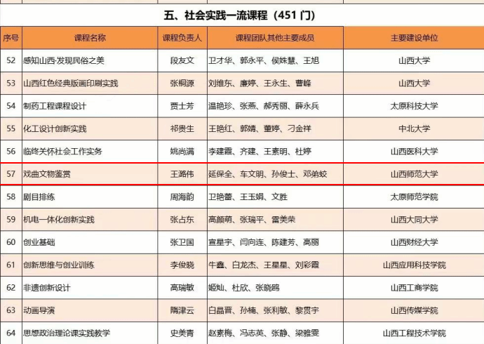 王潞伟院长担任课程负责人,延保全教授、车文明教授、孙俊士教授、邓弟蛟副教授等为主要成员的《戏曲文物鉴赏》课程,成功入选第三批国家级一流本科课程“社会实践”课程类别。