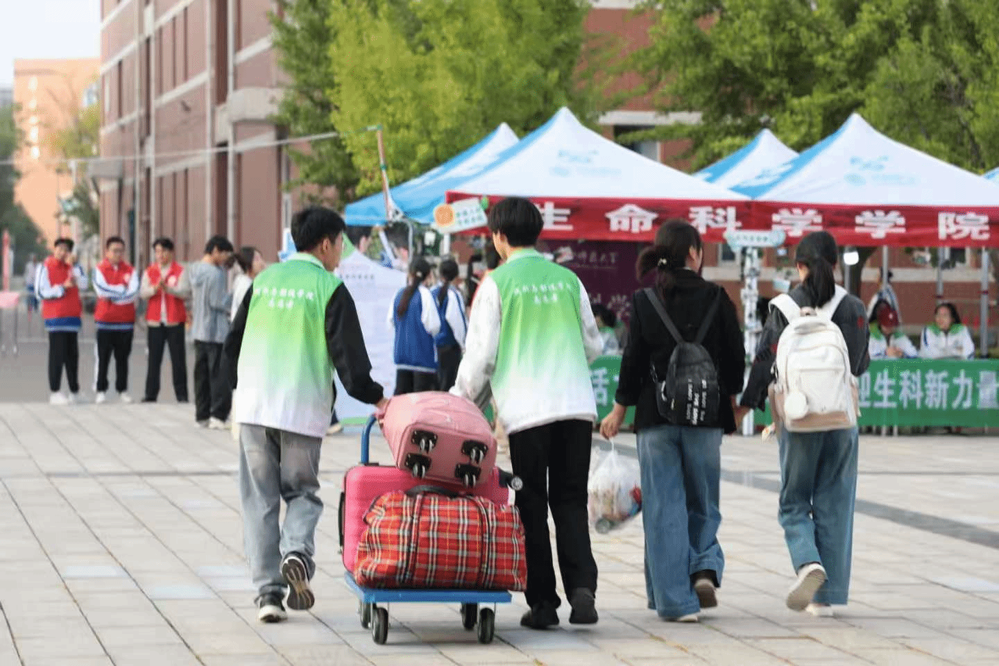 2025级新生迎新工作在南区书香广场北侧和北区篮球场有序开展。志愿者们身着统一服装,精神饱满地迎接来自全国各地的新同学。