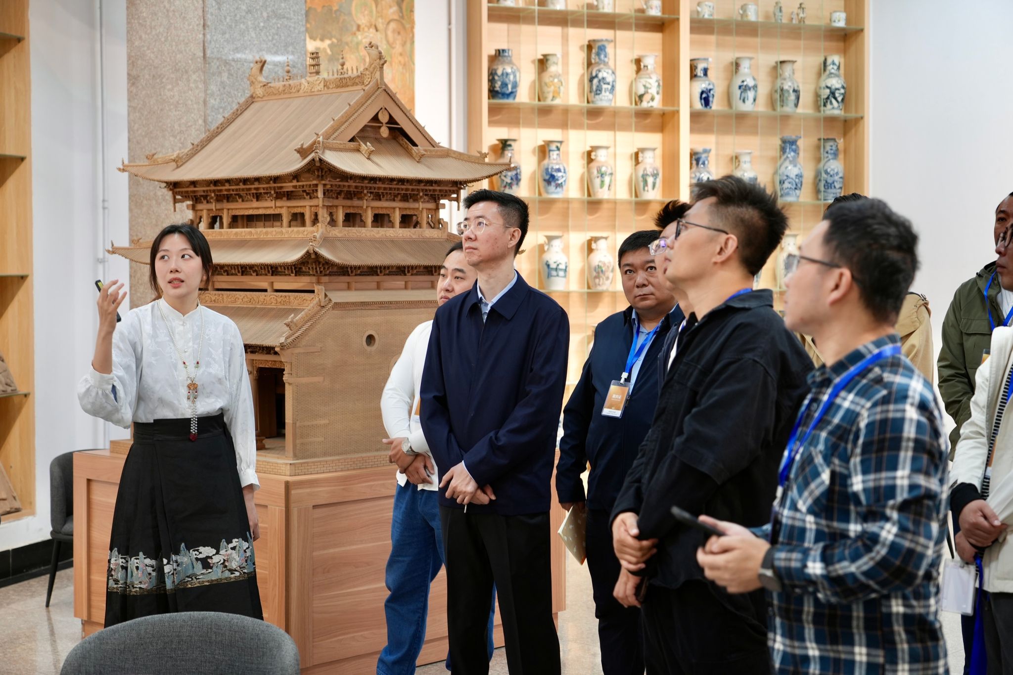 活动伊始,相关领导和专家参观了校内戏曲博物馆。作为山西戏曲文化传承与研究的重要基地,该博物馆设有五大专题展室,收藏包括宋金元戏曲砖雕、碑刻拓片、元代神庙戏台模型等珍贵文物,系统呈现山西戏曲古建筑与非遗文化成果。专业讲解员结合文物背后的历史背景与戏曲内涵,为嘉宾作了生动讲解。本次参观不仅使嘉宾沉浸式体验晋韵文化的魅力,也为微短剧创作汲取本土文化元素、融入地方特色提供了灵感,呼应了“晋韵华章”的主题。