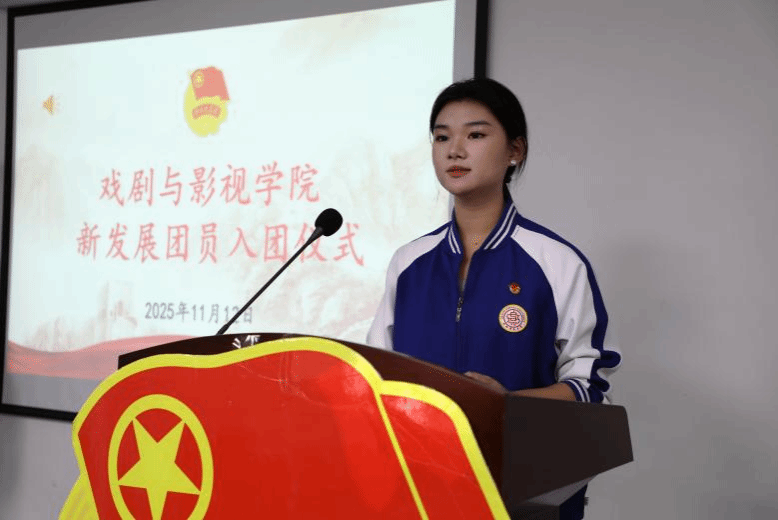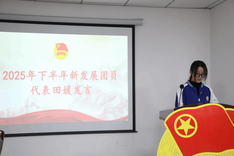 第三项,2025年下半年新发展团员代表田媛上台发言,分享了她的感悟与决心。她谈到,能够加入中国共产主义青年团,深感无上光荣,同时也清醒地认识到肩上所承载的期望与重任。