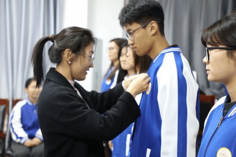 学院团委李蓓蓓老师为新发展团员们佩戴上团徽。这枚佩戴在胸前的徽章,不仅代表着组织的认可与信赖,更象征着责任与担当的传承。新团员们目光坚定,展现出新时代青年的精神风貌。
