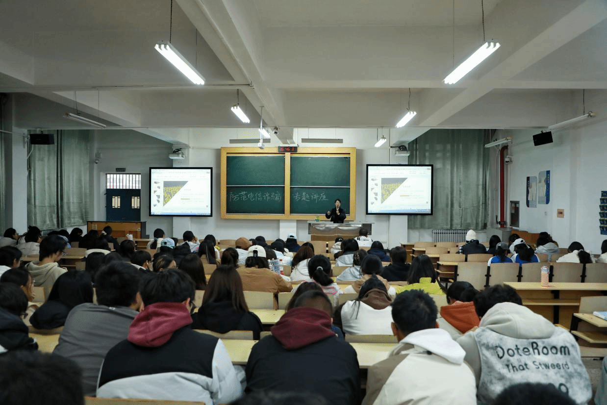 讲座首个环节围绕“网络安全与诈骗防范”展开,马阳升老师结合近年来针对大学生群体高发的网络诈骗案例,为新生系统讲解网络安全知识。内容涵盖个人信息保护、电信诈骗、校园贷陷阱等与新生生活紧密相关的安全要点,通过数据解读、案例拆解等方式,深入浅出地剖析诈骗分子的常用手段与漏洞。