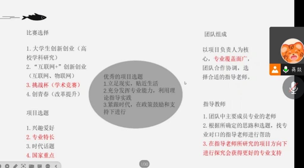 在创新创业大赛中取得优异成绩的蒋燚学长分享他的经验和感悟。蒋燚首先为我们讲解了大学生创新创业的各类比赛并分享不同比赛的特点,让同学们可以在自己擅长的领域选择更适合自己的比赛。同时学长也分析了优秀项目选题的内涵和团队组成的重要性。