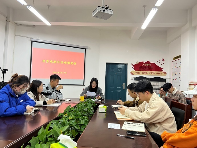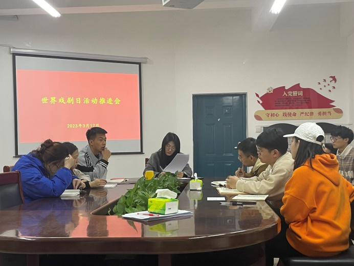 团委学生会于201会议室召开世界戏剧日活动推进会议。本次会议由院团委副书记李蓓蓓老师主持,学院团委学生会各部门负责人到会参加。