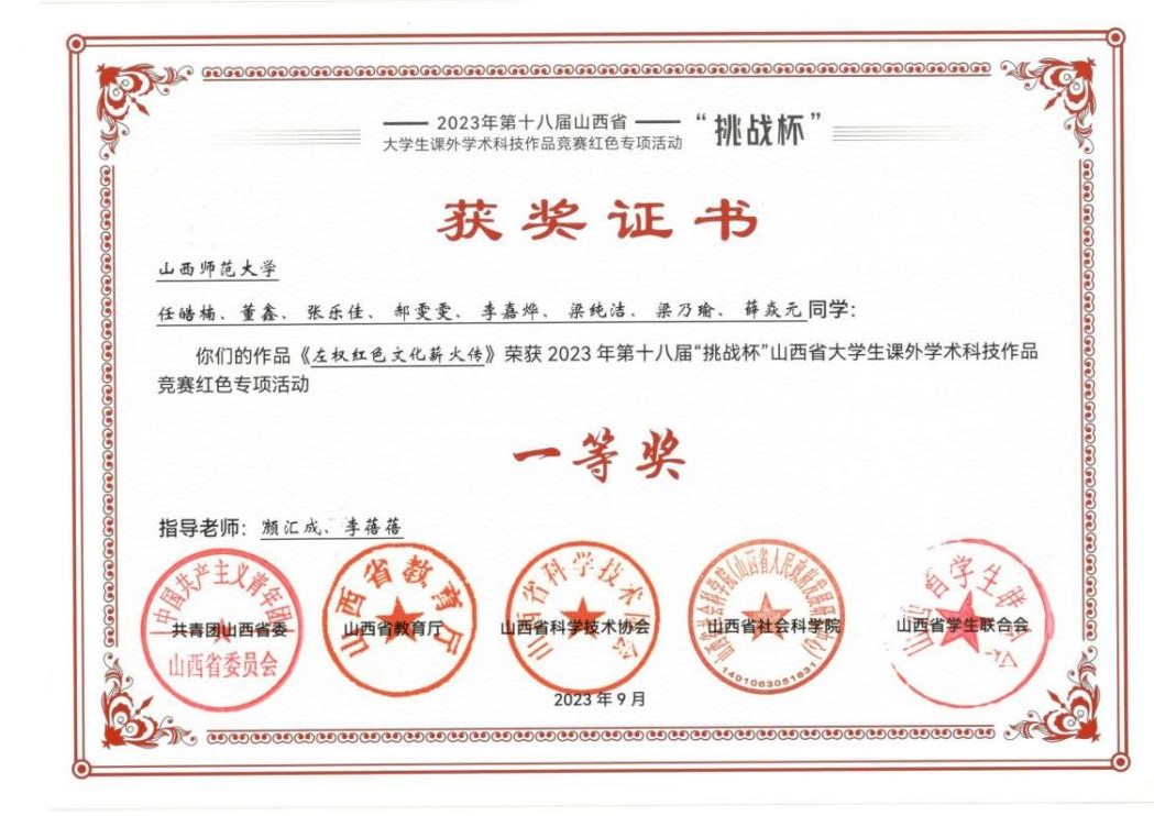 任皓楠、董鑫、张乐佳、郝雯雯、李嘉烨、梁纯洁、梁乃瑜、薛焱元等8位同学的参赛作品《左权红色文化薪火传》(指导教师:颜汇成、李蓓蓓)荣获省赛一等奖。
