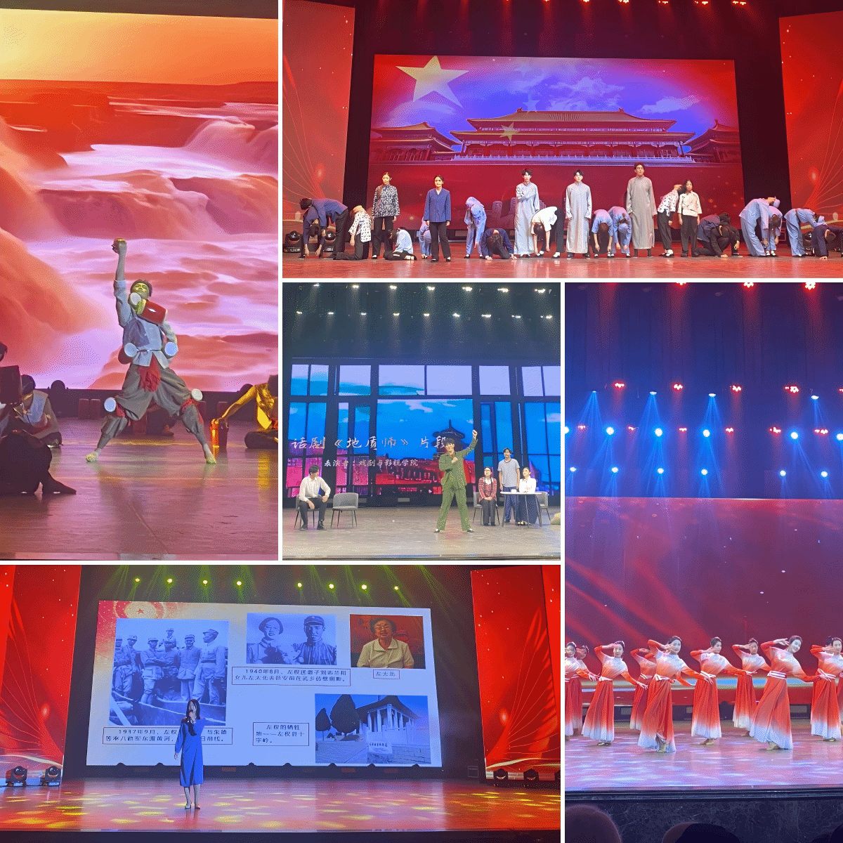 的同学用话剧塑造了党史发展中为革命而奋斗牺牲的烈士群像;音乐学院的同学用优美的舞姿诠释了共产党带领人民走向幸福生活的喜悦;宣讲团成员和党史研究院的红色讲解员们,诵读出了党中央引领全国人民走向复兴的光辉形象。晚会将党史发展融入节目内容,生动描绘出中国共产党带领全国人民努力奋斗的时代宏图。