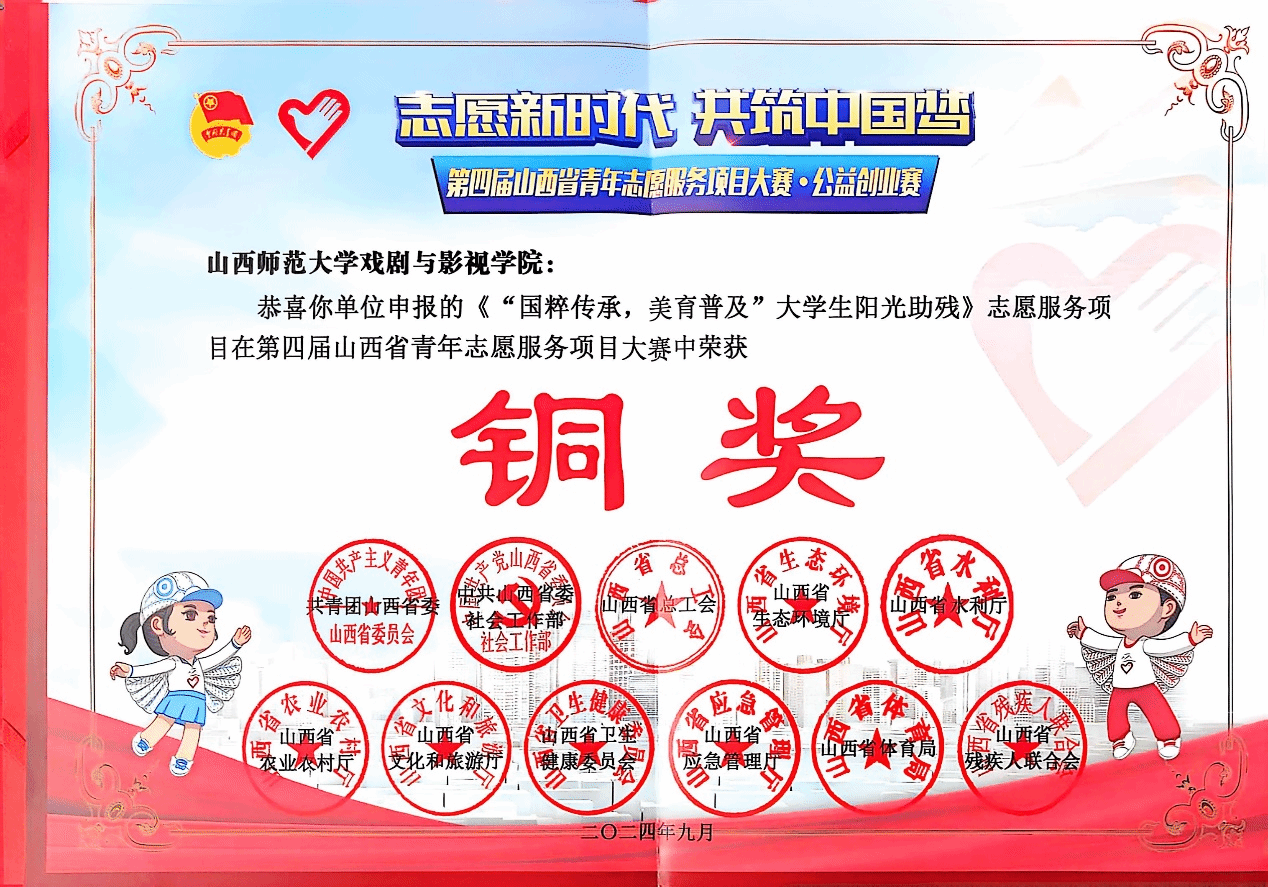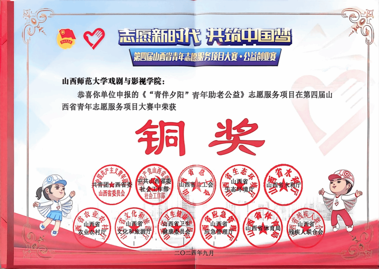 “青伴夕阳”青年助老公益志愿服务项目、“国粹传承,美育普及”大学生阳光助残志愿服务项目荣获两枚铜奖。