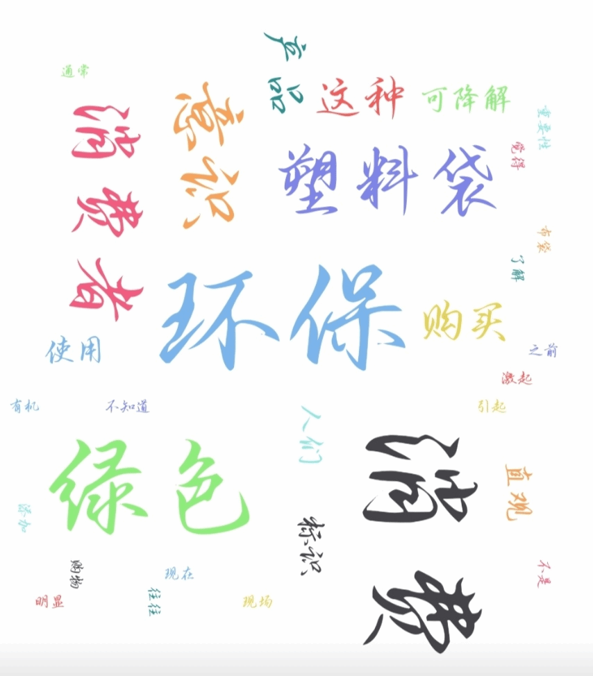 首先在关于“绿色消费的定义”调查中,受访者看法不一,多数人认为绿色消费是“使用环保产品”,部分人选择“减少浪费”,少数人提及“支持可持续品牌”,可见学生对可持续品牌的认知有待提升。其次在购买决策上,产品的环保属性与设计理念影响显著。消费需求与问题调查中,食堂成为关注重点,存在就餐拥挤、健康餐选择少、零食购买不便等情况。对于“绿色消费能否提升环保意识”,调查发现 “环保”“绿色”“消费”高频出现,说明大家认为二者紧密相关,比如可降解塑料袋、有机产品会让人消费时联想到环保。