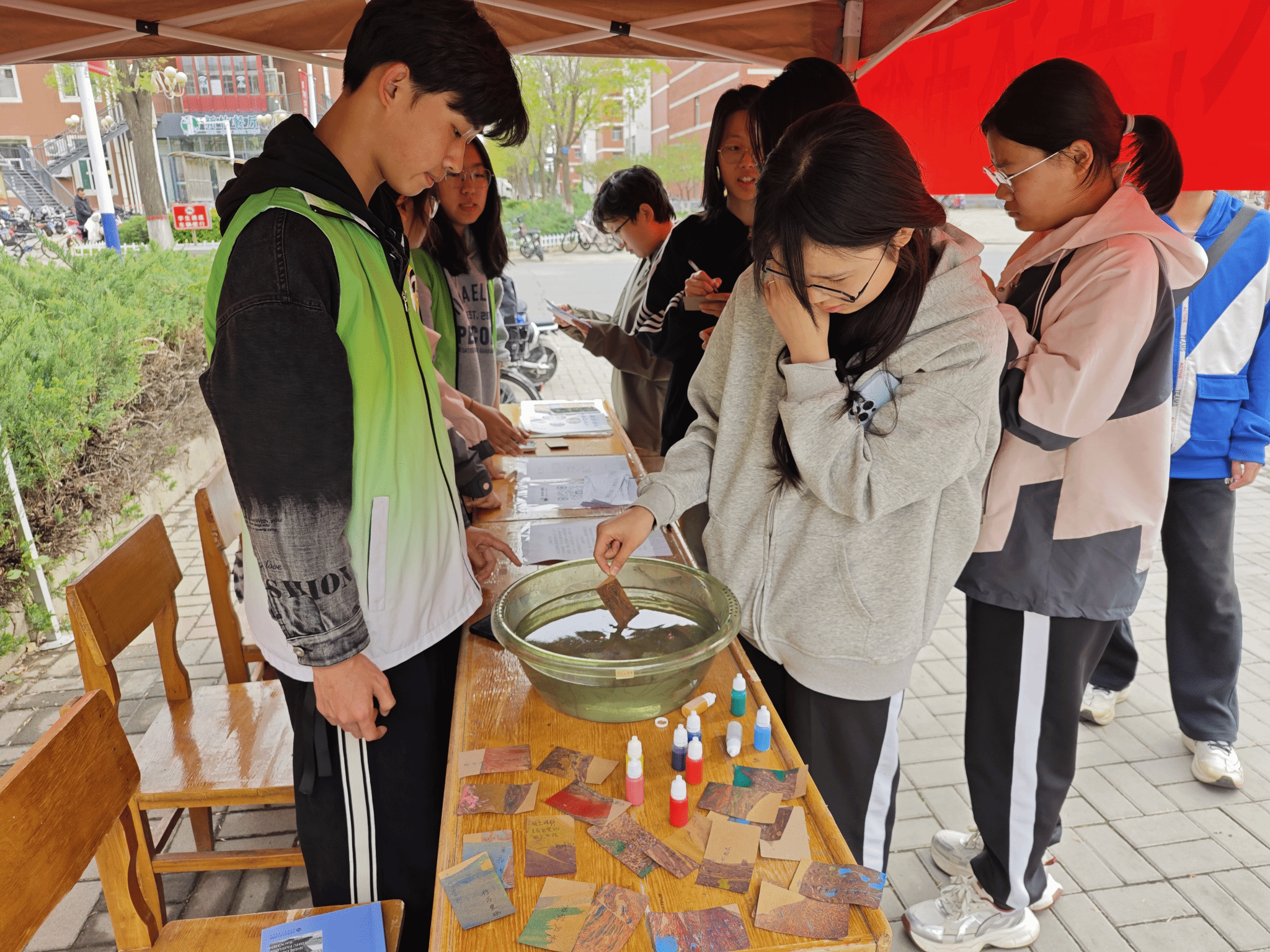 4月21日至23日,四五号教学楼间的线下活动以趣味互动点燃校园热情。在“书籍飞花令”环节,同学们以书名的尾字为起点展开文学接龙,展现深厚的文学积淀与敏捷才思。“漆彩书韵”手工区则吸引师生沉浸于非遗体验,大家亲手调制传统大漆颜料,在空白书签上绘制图案并题写诗词,将匠心与文脉融于方寸之间。“你画我猜”环节更是妙趣横生,志愿者用简笔画勾勒《西游记》《小王子》等经典元素,参与者争相竞猜,现场笑声与掌声此起彼伏。