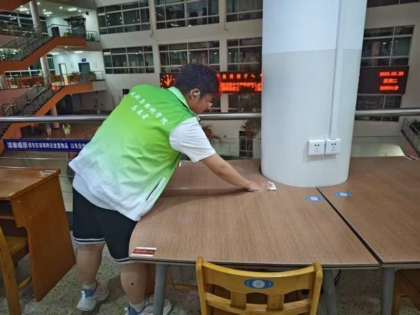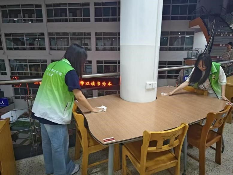 活动伊始,负责人进行清扫任务分工,志愿者们开始以高效执行力和饱满热情展开清扫,对图书馆桌椅、地面、楼道附体等公共区域进行细致清洁。在志愿者的共同努力下,图书馆各学习区域焕然一新,展现出崭新风貌。