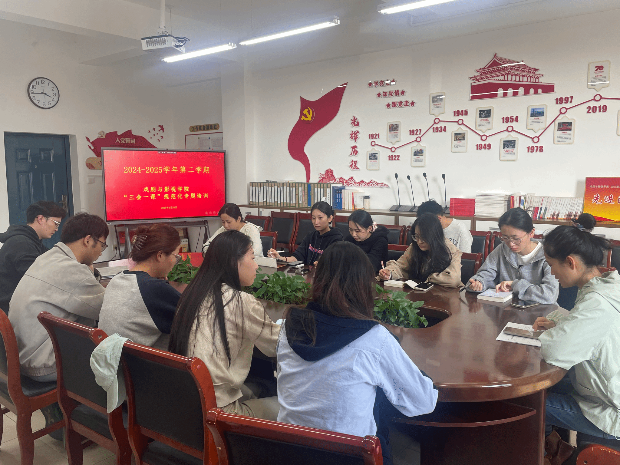 “三会一课”规范专题培训会在201会议室举行。本次会议由学院专职组织员张海霞主持,晋风、晋影、晋戏、晋才、晋师五个党支部负责人及支委会成员到场参加。