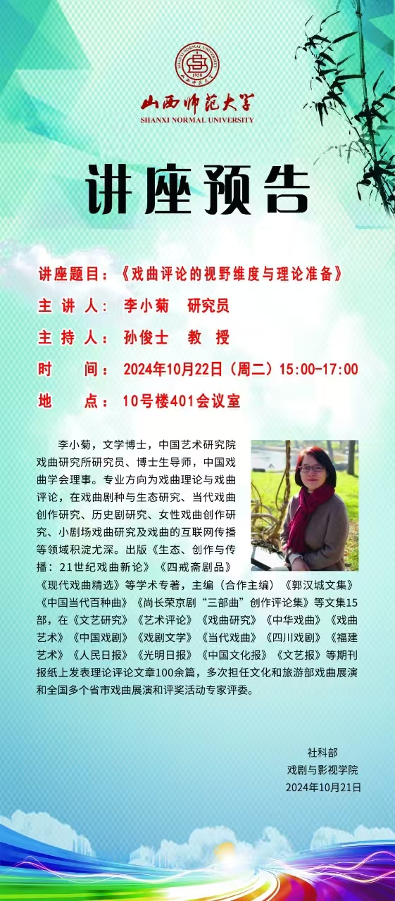 全球赌盘实时动态 拟于10月22日(周二)15:00-17:00在南区10号楼401会议室举办《戏曲评论的视野维度与理论准备》讲座,主讲人为李小菊研究员,本次讲座由副院长孙俊士教授主持。