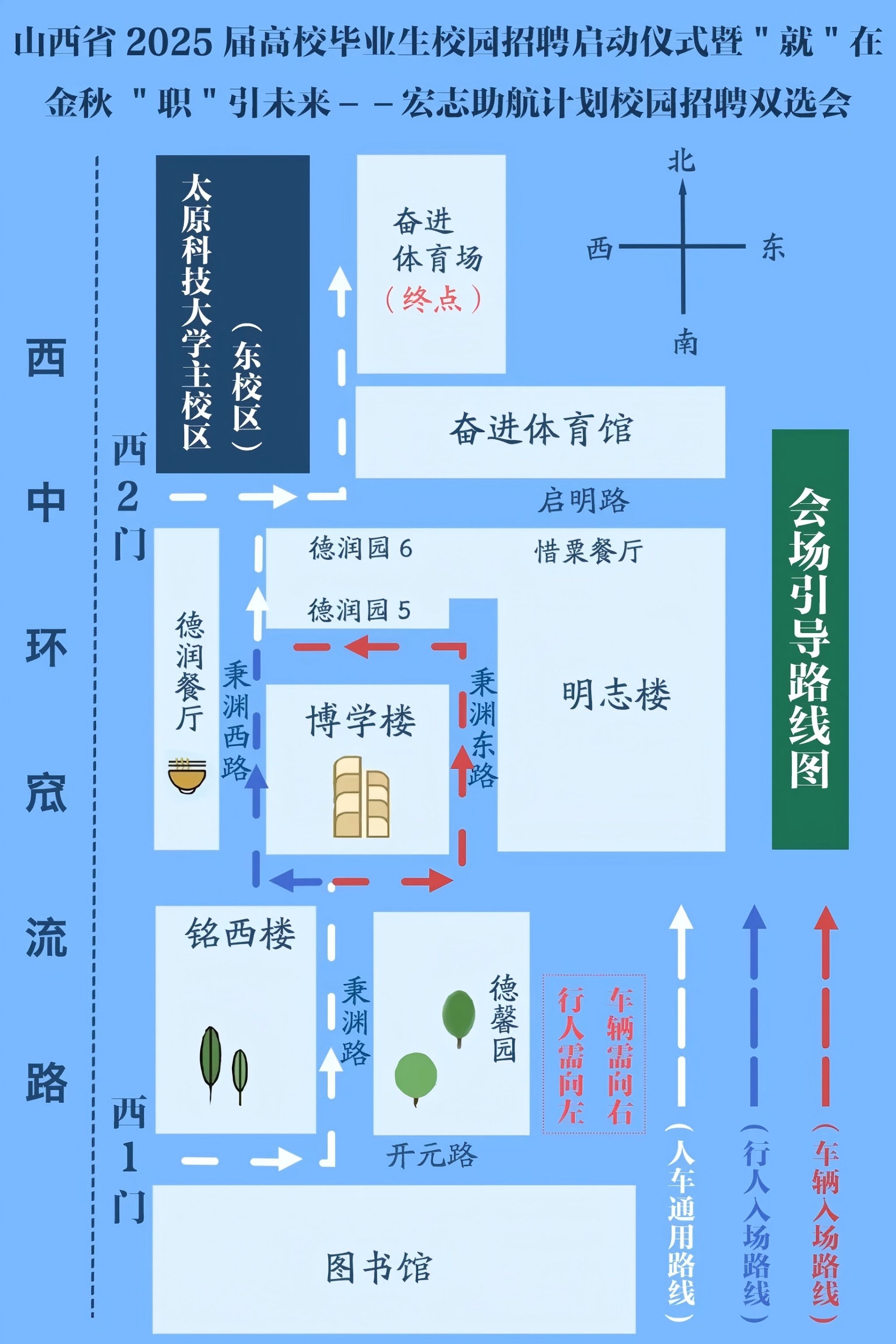 外校学生可持学生证、身份证或简历从太原科技大学主校区(东校区)西1门或西2门入校,沿路牌指示标进入会场;本校学生到场后需要打开企业微信扫码签到。