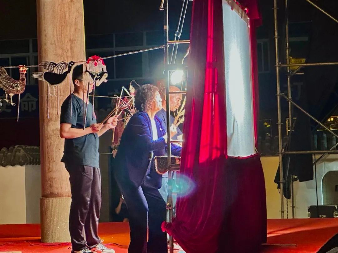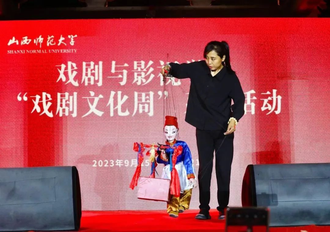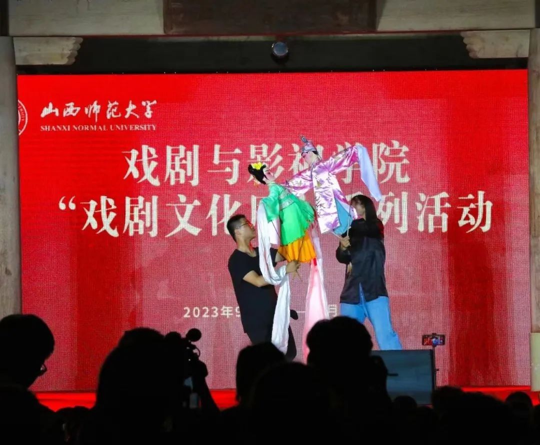 9月17日晚,山西师范大学戏曲文化园上演木偶皮影戏。木偶戏有《十八里相送》《小货郎》《变脸》《戏春姑》等剧目。木偶造型栩栩如生,表演细腻生动。演出过程中,木偶戏传承人邀请台下观众上台体验操纵木偶的感觉,将现场气氛推向了高潮。